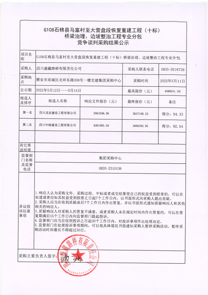 四川康藏路橋有限責任公司G108線石棉縣馬富村至大營盤段恢復重建工程(十標)橋梁治理、邊坡整治工程專業(yè)分包競爭談判采購結(jié)果公示