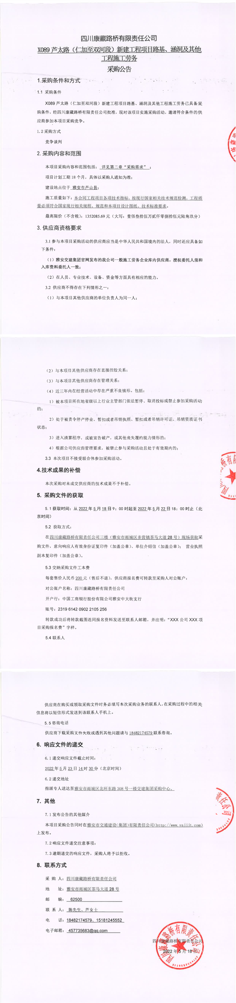 四川康藏路橋有限責(zé)任公司X089蘆太路(仁加至雙河段)新建工程項目路基、涵洞及其他工程施工勞務(wù)采購公告