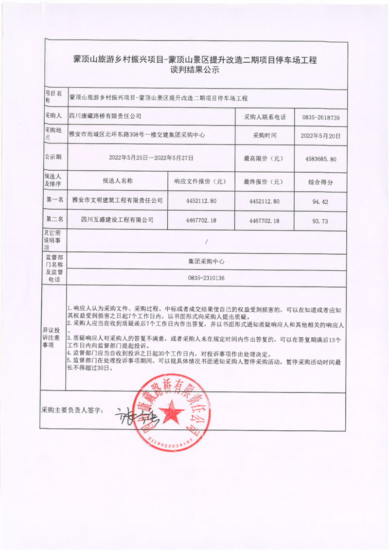 四川康藏路橋有限責(zé)任公司蒙頂山旅游鄉(xiāng)村振興項(xiàng)目-蒙頂山景區(qū)提升改造二期項(xiàng)目停車場工程談判結(jié)果公示