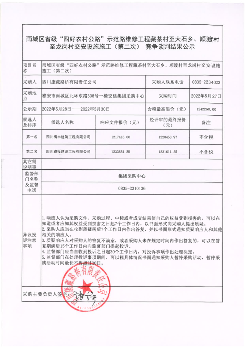四川康藏路橋有限責(zé)任公司雨城區(qū)省級(jí)“四好農(nóng)村公路”示范路維修工程藏茶村至大石鄉(xiāng)、順渡村至龍崗村交安設(shè)施施工(第二次)競爭談判結(jié)果公示