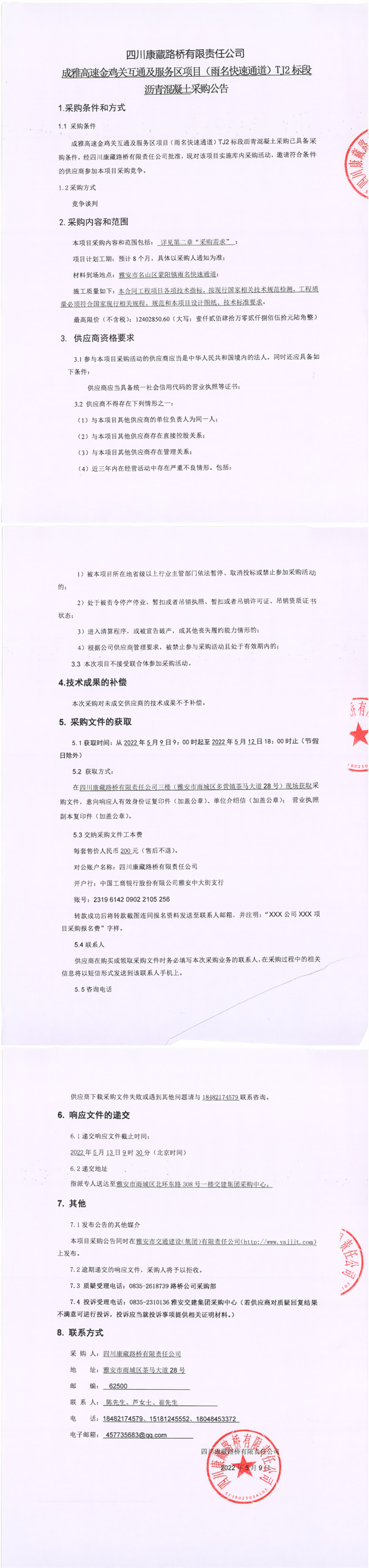 四川康藏路橋有限責(zé)任公司成雅高速金雞關(guān)互通及服務(wù)區(qū)項(xiàng)目(雨名快速通道)TJ2標(biāo)段瀝青混凝土采購公告