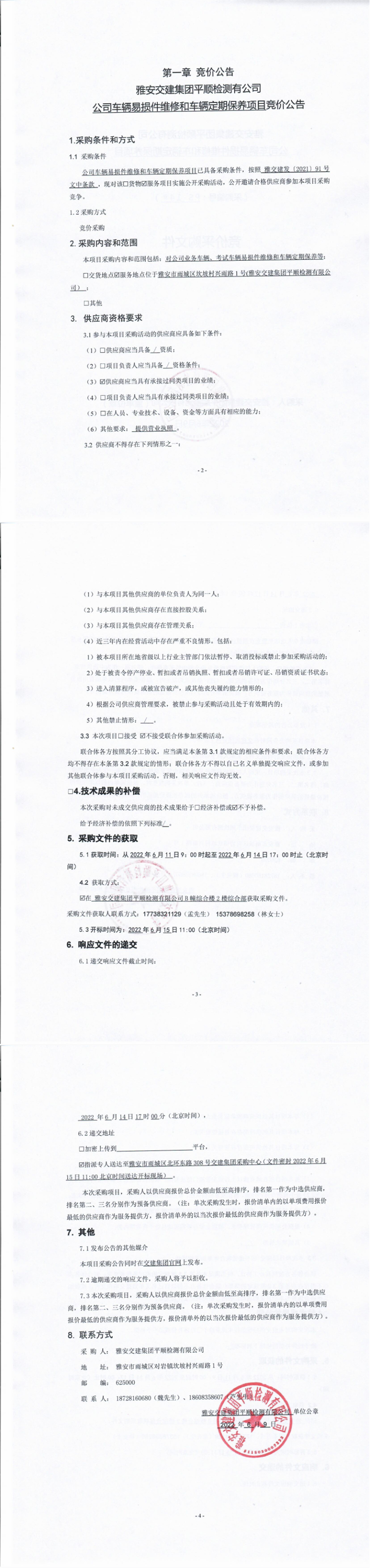 雅安交建集團平順檢測有限公司公司車輛易損件維修和車輛定期保養(yǎng)項目競價公告