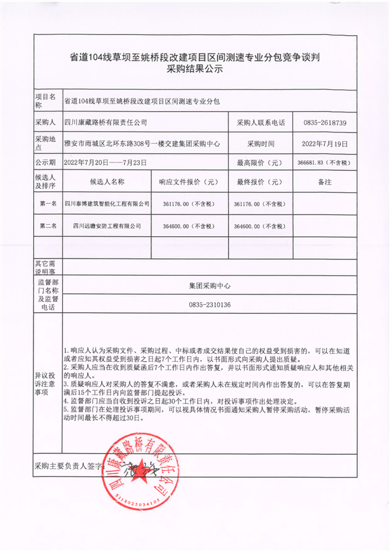 四川康藏路橋有限責(zé)任公司省道104線(xiàn)草壩至姚橋段改建項(xiàng)目區(qū)間測(cè)速專(zhuān)業(yè)分包競(jìng)爭(zhēng)談判采購(gòu)結(jié)果公示