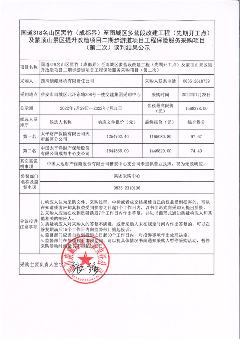 四川康藏路橋有限責任公司國道318名山區(qū)黑竹(成都界)至雨城區(qū)多營段改建工程(先期開工點)及蒙頂山景區(qū)提升改造項目二期步游道項目工程保險服務采購項目(第二次)談判結果公示
