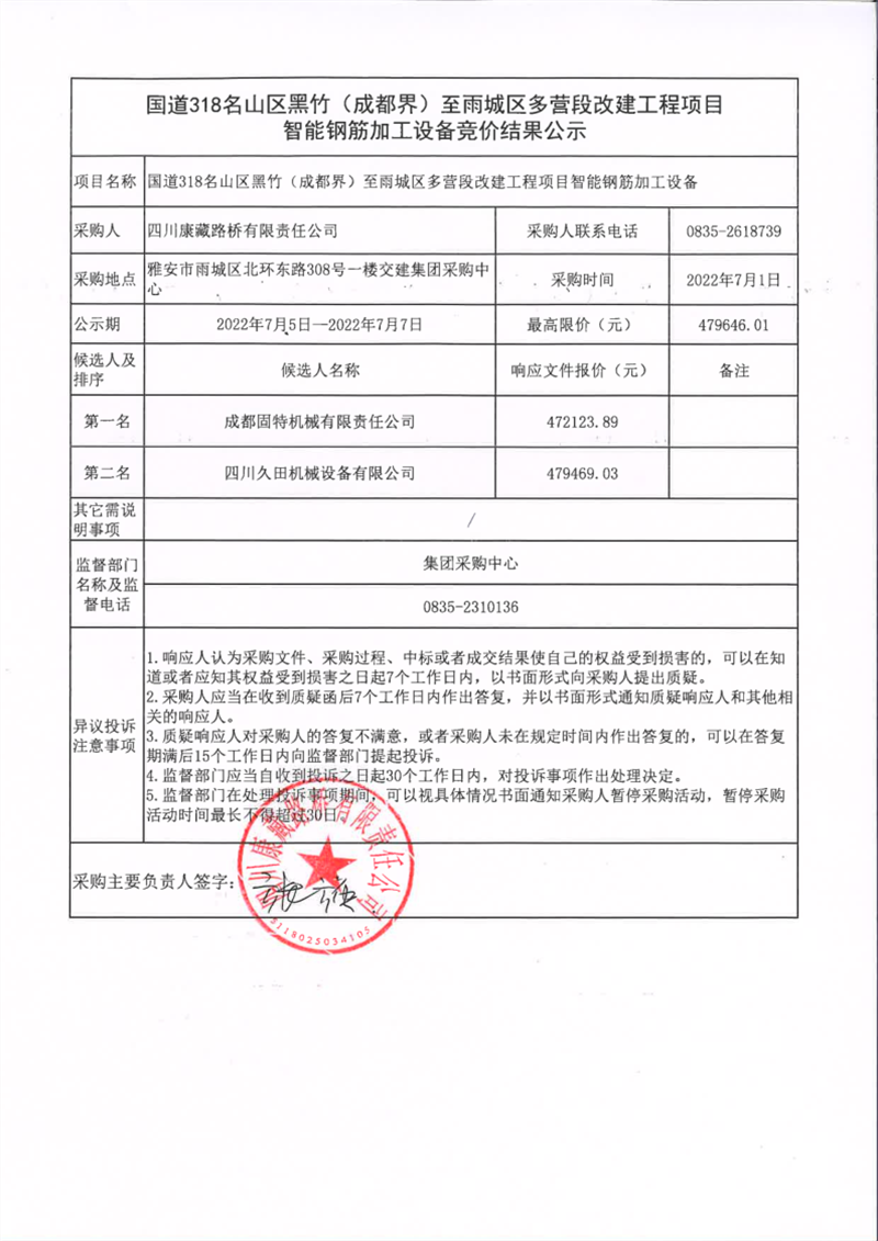 四川康藏路橋有限責任公司國道318名山區(qū)黑竹(成都界)至雨城區(qū)多營段改建工程智能鋼筋加工設備競價結果公示