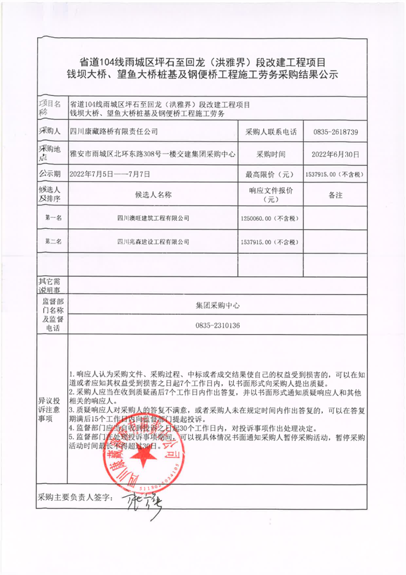 四川康藏路橋有限責任公司省道104線雨城區(qū)坪石至回龍(洪雅界)段改建工程項目錢壩大橋、望魚大橋樁基及鋼便橋工程施工勞務(wù)采購結(jié)果公示