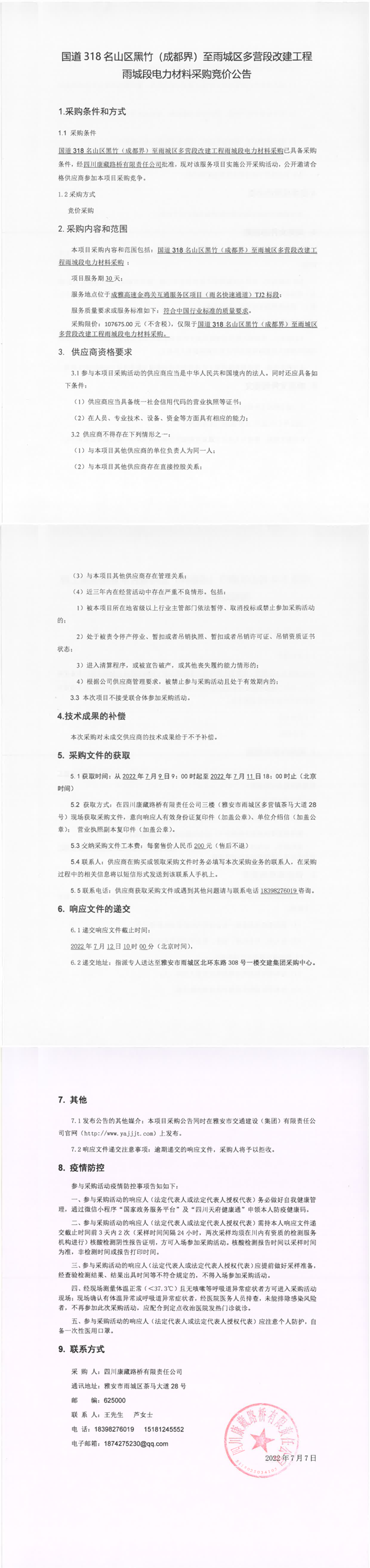 四川康藏路橋有限責(zé)任公司國道318名山區(qū)黑竹(成都界)至雨城區(qū)多營段改建工程雨城段電力材料采購競(jìng)價(jià)公告