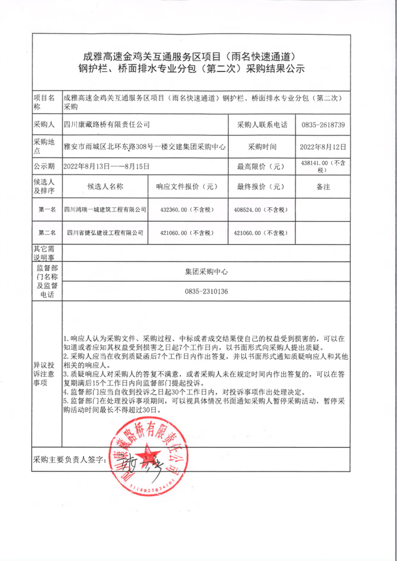 四川康藏路橋有限責(zé)任公司成雅高速金雞關(guān)互通服務(wù)區(qū)項目(雨名快速通道)鋼護欄、橋面排水專業(yè)分包(第二次)采購結(jié)果公示