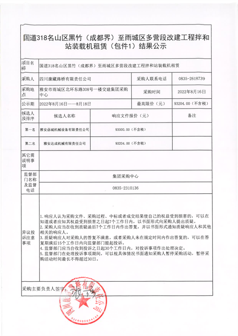 四川康藏路橋有限責(zé)任公司國道318名山區(qū)黑竹(成都界)至雨城區(qū)多營(yíng)段改建工程拌和站裝載機(jī)租賃(包件1)結(jié)果公示