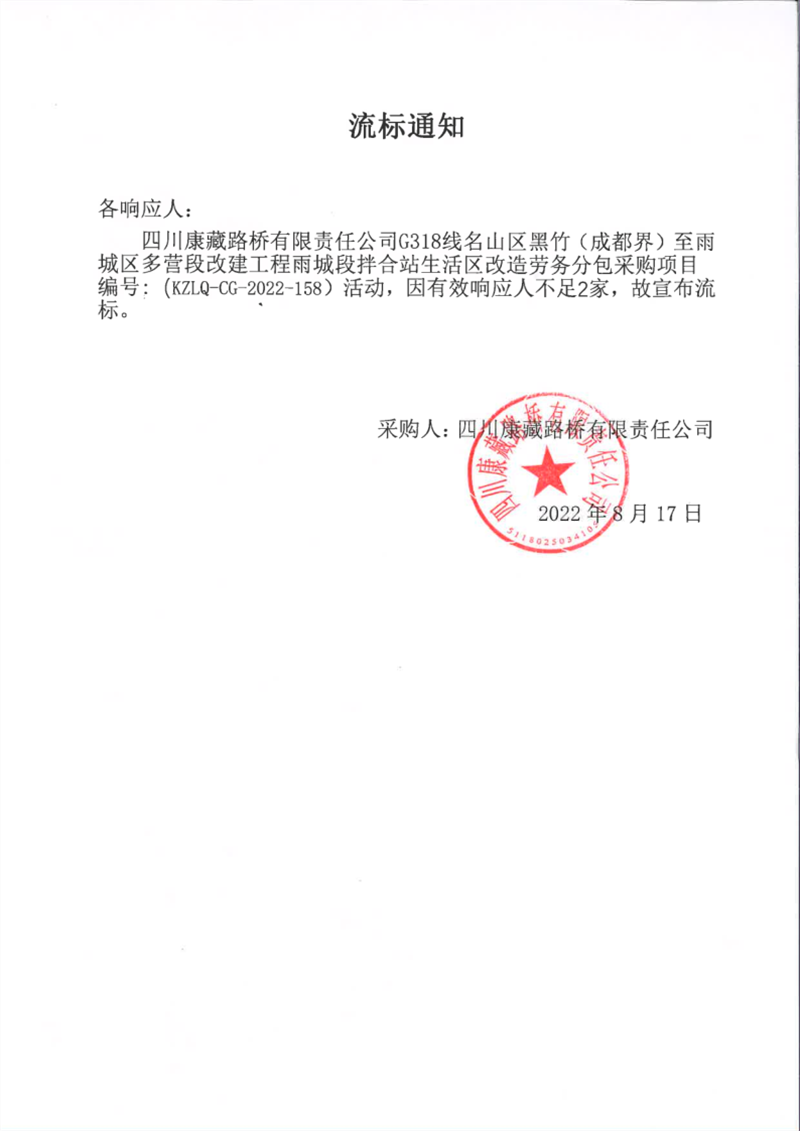 四川康藏路橋有限責(zé)任公司G318線名山區(qū)黑竹(成都界)至雨城區(qū)多營(yíng)段改建工程雨城段拌合站生活區(qū)改造勞務(wù)分包采購(gòu)項(xiàng)目流標(biāo)通知