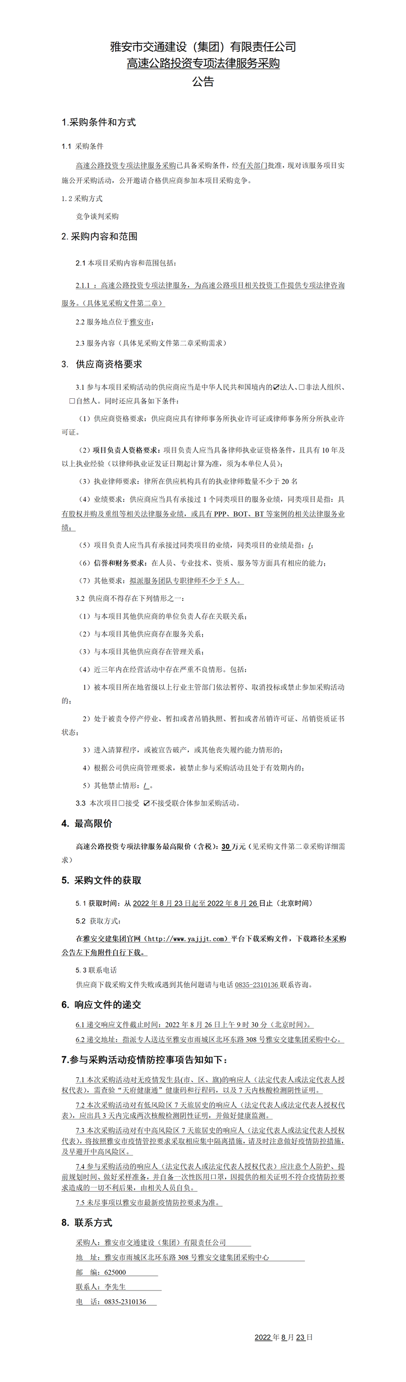 雅安市交通建設(shè)(集團(tuán))有限責(zé)任公司高速公路投資專(zhuān)項(xiàng)法律服務(wù)采購(gòu)競(jìng)爭(zhēng)談判文件