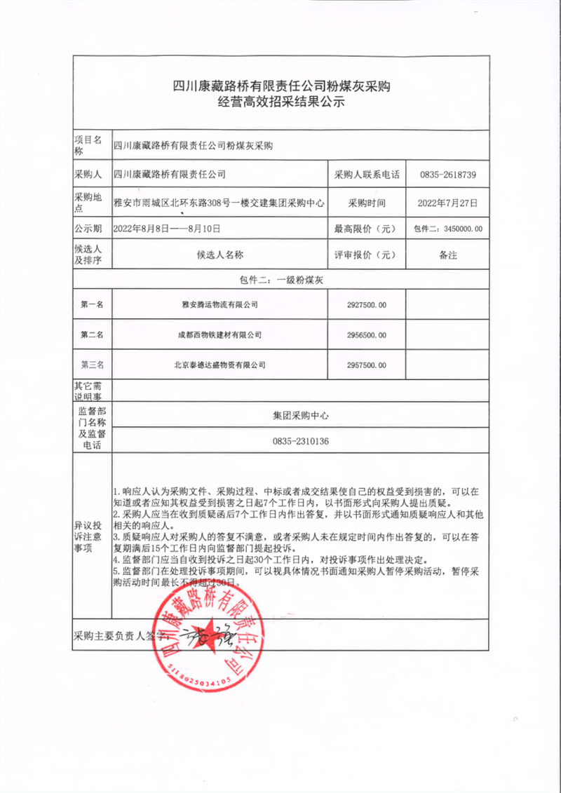 四川康藏路橋有限責(zé)任公司粉煤灰采購經(jīng)營(yíng)高效招采結(jié)果公示
