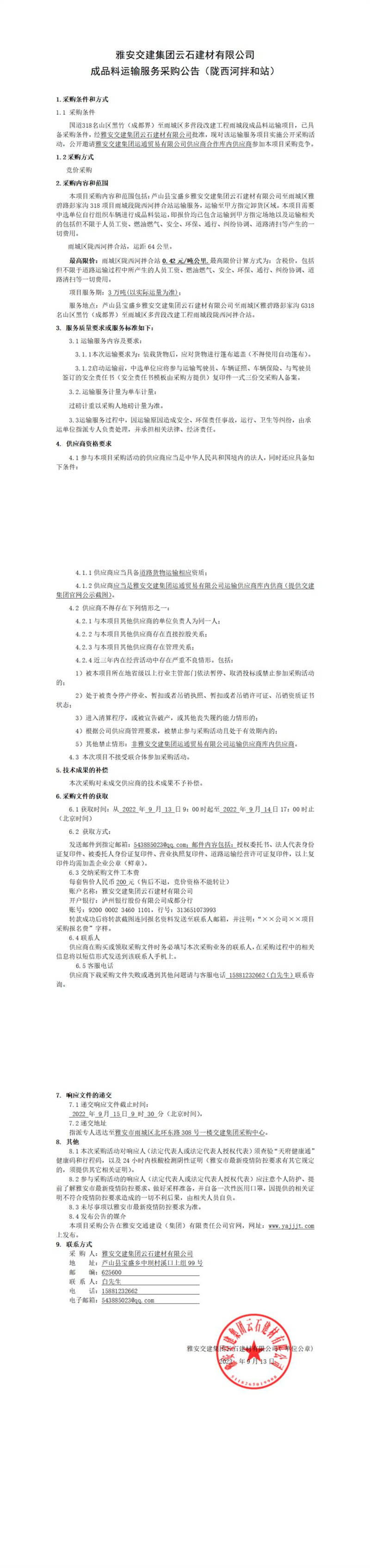 雅安交建集團(tuán)云石建材有限公司成品料運(yùn)輸服務(wù)采購(gòu)公告(隴西河拌和站)