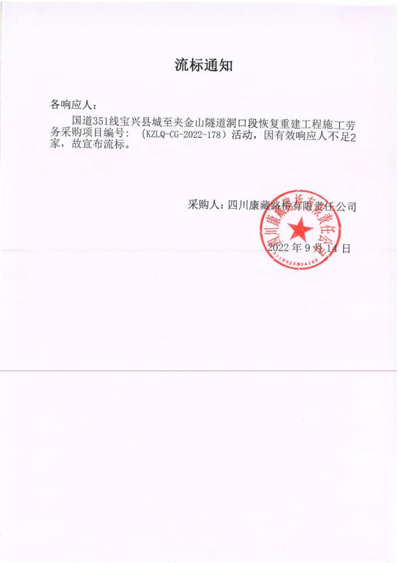 四川康藏路橋有限責任公司國道351線寶興縣城至夾金山隧道洞口段恢復(fù)重建工程施工勞務(wù)采購流標通知