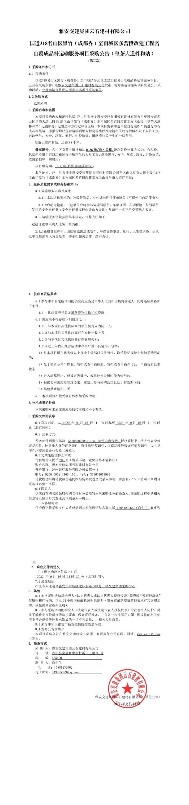 雅安交建集團(tuán)云石建材有限公司國道318名山區(qū)黑竹(成都界)至雨城區(qū)多營段改建工程名山段成品料運(yùn)輸服務(wù)項(xiàng)目采購公告(皇茶大道拌和站)