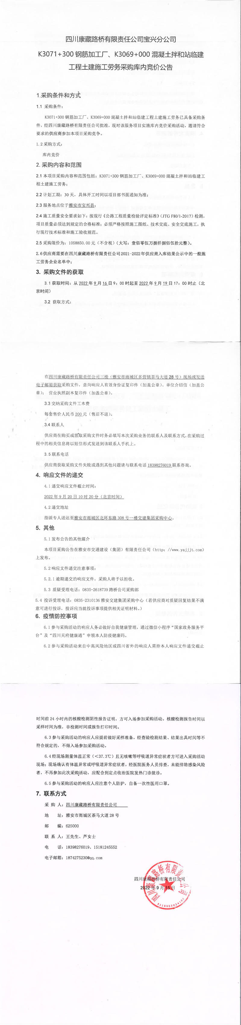 四川康藏路橋有限責(zé)任公司寶興分公司K3071+300鋼筋加工廠、K3069+000混凝土拌和站臨建工程土建施工勞務(wù)采購(gòu)庫內(nèi)競(jìng)價(jià)公告