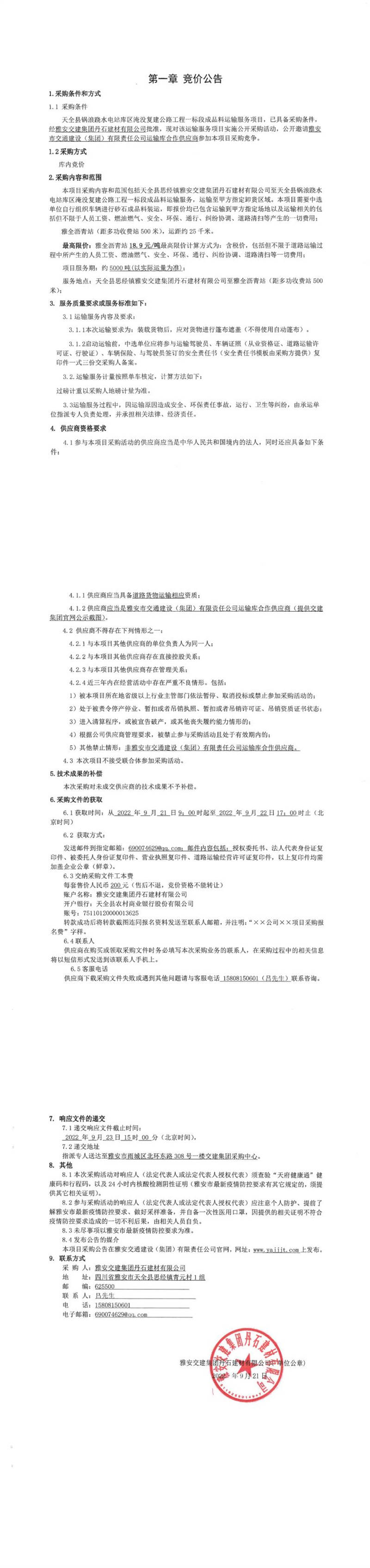 雅安交建集團(tuán)丹石建材有限公司天全縣鍋浪蹺水電站庫區(qū)淹沒復(fù)建公路工程一標(biāo)段成品料運(yùn)輸服務(wù)項(xiàng)目競(jìng)價(jià)公告