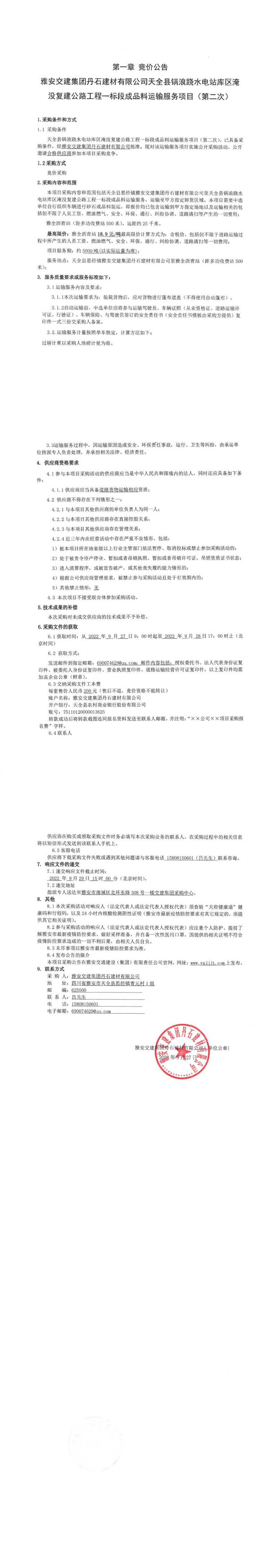 雅安交建集團(tuán)丹石建材有限公司天全縣鍋浪蹺水電站庫區(qū)淹沒復(fù)建公路工程一標(biāo)段成品料運(yùn)輸服務(wù)項(xiàng)目(第二次)競(jìng)價(jià)公告
