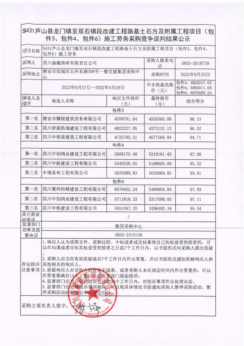 四川康藏路橋有限責(zé)任公司S431蘆山縣龍門鎮(zhèn)至雙石鎮(zhèn)段改建工程路基土石方及附屬工程項目(包件3、包件4、包件6)施工勞務(wù)采購競爭談判結(jié)果公示