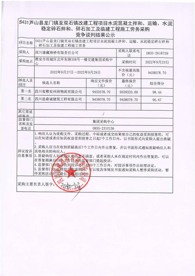 四川康藏路橋有限責(zé)任公司S431蘆山縣龍門鎮(zhèn)至雙石鎮(zhèn)改建工程項目水泥混凝土拌和、運輸、水泥穩(wěn)定碎石拌和、碎石加工及臨建工程施工勞務(wù)采購競爭談判結(jié)果公示
