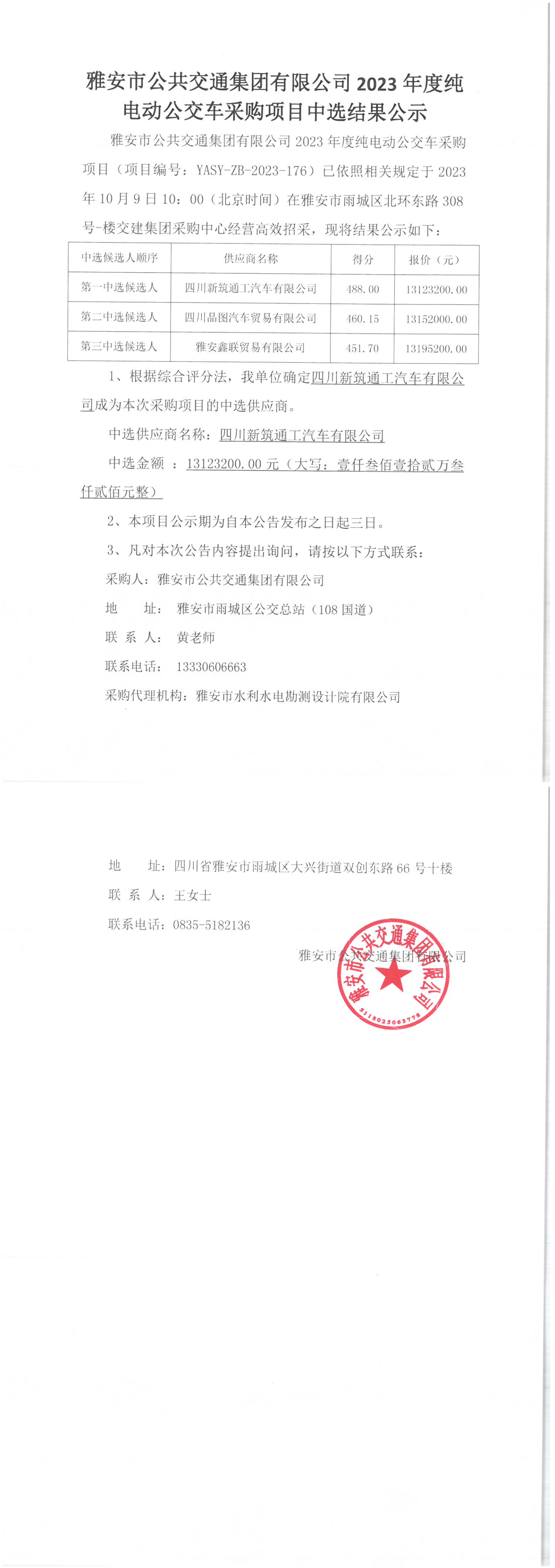 雅安市公共交通集團有限公司2023年度純電動公交車采購項目中選結果公示