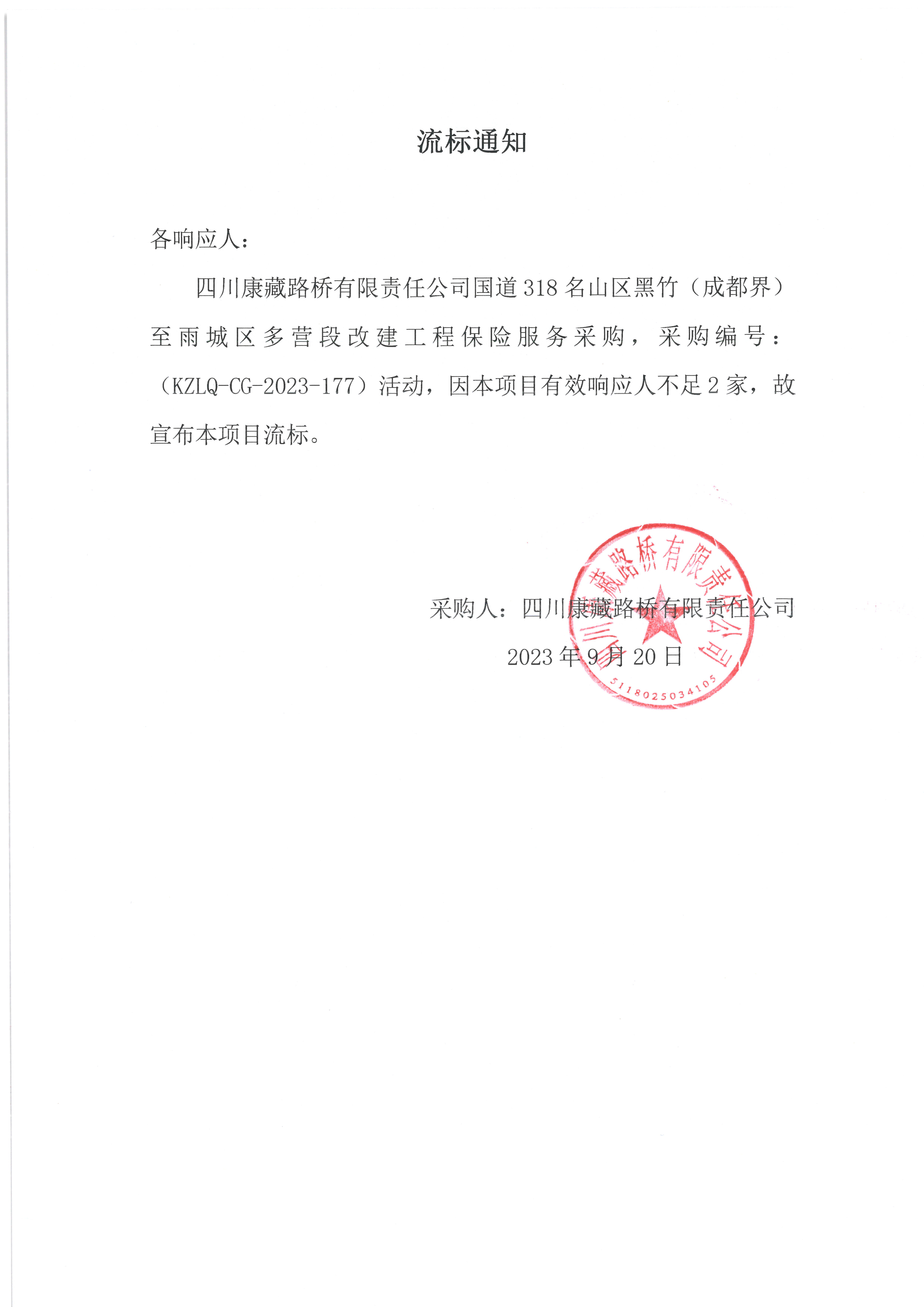 四川康藏路橋有限責任公司國道318名山區(qū)黑竹(成都界)至雨城區(qū)多營段改建工程保險服務采購流標通知