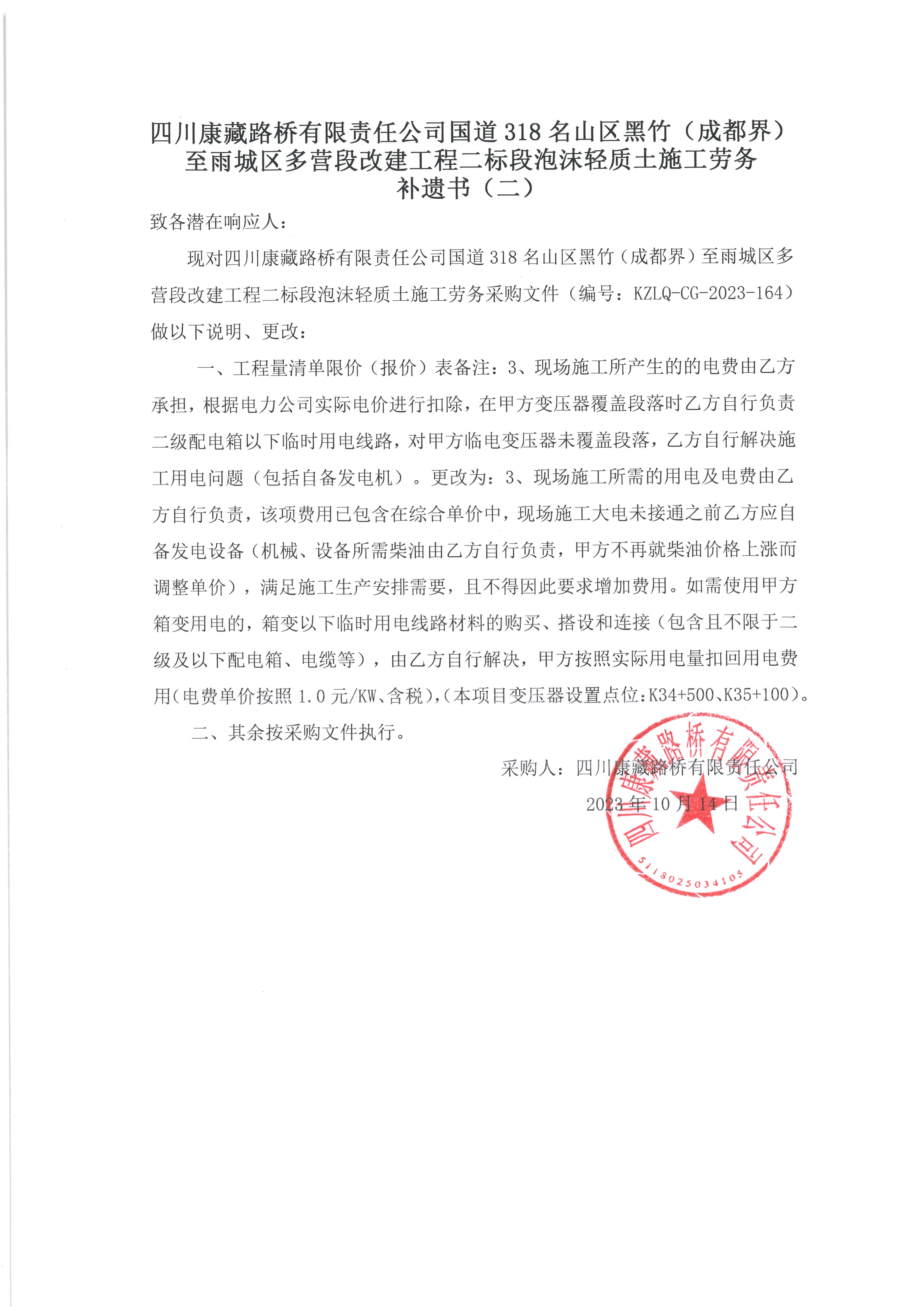 四川康藏路橋有限責(zé)任公司國(guó)道318名山區(qū)黑竹(成都界)至雨城區(qū)多營(yíng)段改建工程二標(biāo)段泡沫輕質(zhì)土施工勞務(wù) 補(bǔ)遺書(shū)(二)