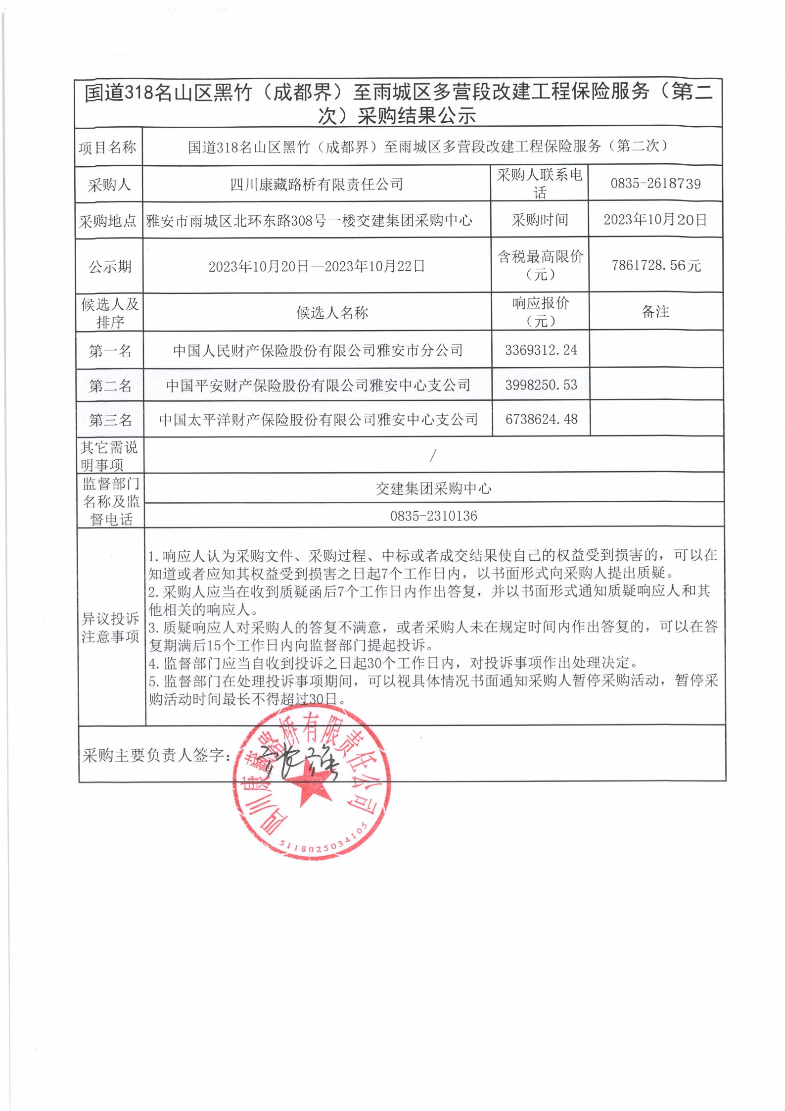 四川康藏路橋有限責(zé)任公司國道318名山區(qū)黑竹(成都界)至雨城區(qū)多營段改建工程保險(xiǎn)服務(wù)(第二次)采購結(jié)果公示