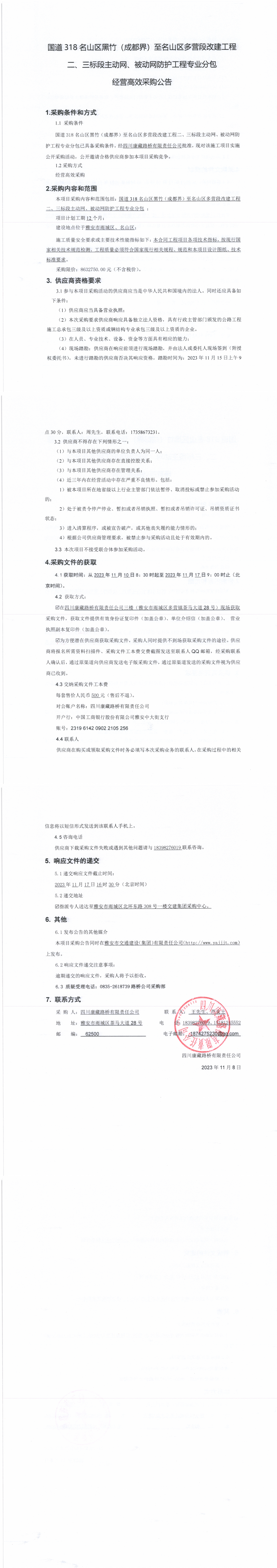 四川康藏路橋有限責(zé)任公司國(guó)道318名山區(qū)黑竹(成都界)至名山區(qū)多營(yíng)段改建工程二、三標(biāo)段主動(dòng)網(wǎng)、被動(dòng)網(wǎng)防護(hù)工程專業(yè)分包經(jīng)營(yíng)高效采購(gòu)公告