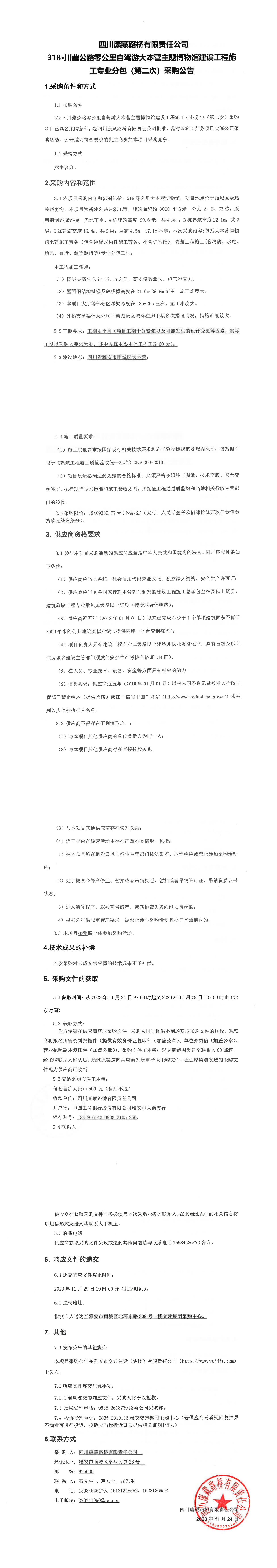 四川康藏路橋有限責(zé)任公司318·川藏公路零公里自駕游大本營主題博物館建設(shè)工程施工專業(yè)分包(第二次)采購公告