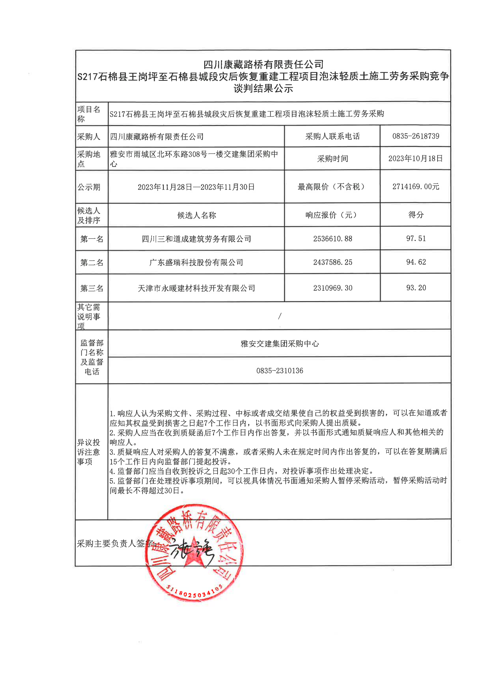四川康藏路橋有限責任公司S217石棉縣王崗坪至石棉縣城段災后恢復重建工程項目泡沫輕質(zhì)土施工勞務采購結果公示