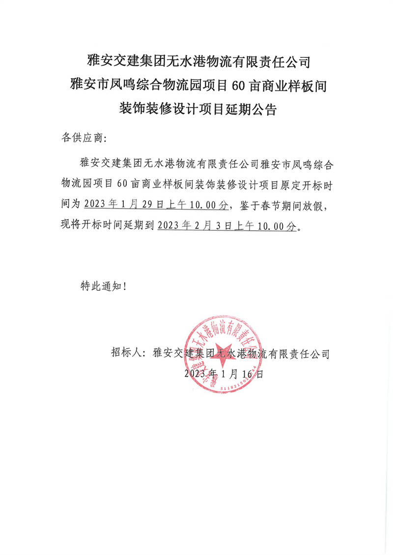 雅安交建集團(tuán)無(wú)水港物流有限責(zé)任公司雅安市鳳鳴綜合物流園項(xiàng)目60畝商業(yè)樣板間裝飾裝修設(shè)計(jì)項(xiàng)目延期公告