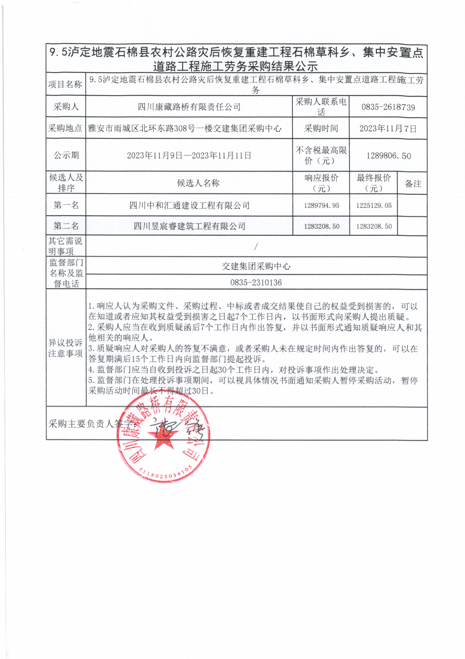 四川康藏路橋有限責(zé)任公司9.5瀘定地震石棉縣農(nóng)村公路災(zāi)后恢復(fù)重建工程石棉草科鄉(xiāng)、集中安置點(diǎn)道路工程施工勞務(wù)采購結(jié)果公示