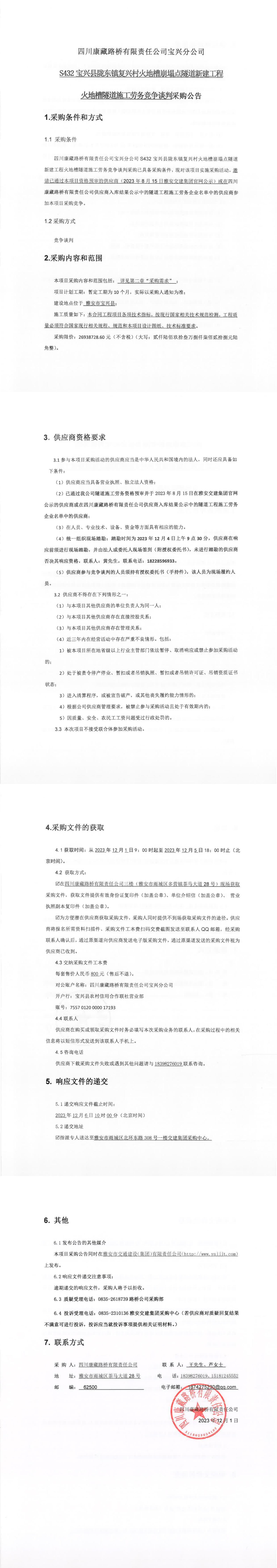 四川康藏路橋有限責任公司寶興分公司S432寶興縣隴東鎮(zhèn)復興村火地槽崩塌點隧道新建工程火地槽隧道施工勞務競爭談判采購公告