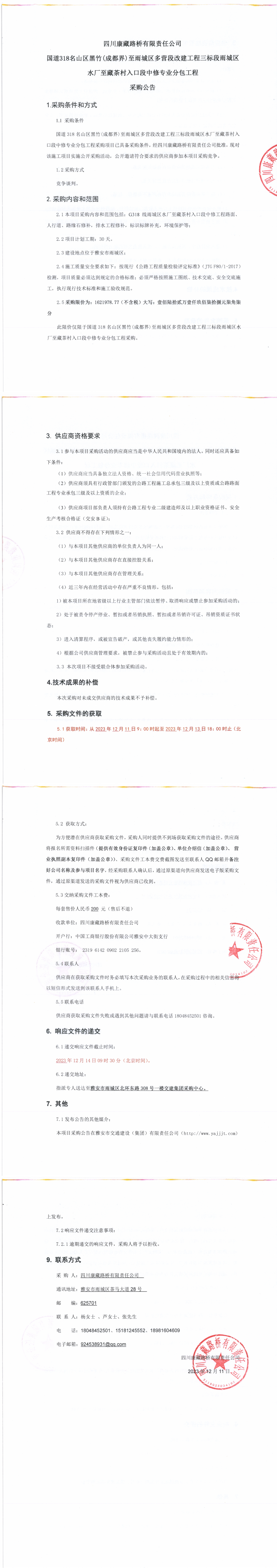 四川康藏路橋有限責(zé)任公司國(guó)道318名山區(qū)黑竹(成都界)至雨城區(qū)多營(yíng)段改建工程三標(biāo)段雨城區(qū)水廠至藏茶村入口段中修專業(yè)分包工程采購(gòu)公告