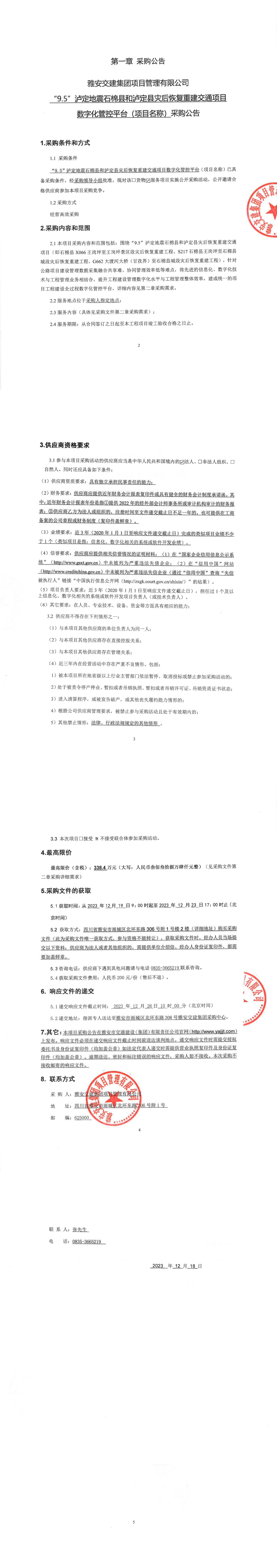 雅安交建集團項目管理有限公司“9.5”瀘定地震石棉縣和瀘定縣災后恢復重建交通項目數字化管控平臺(項目名稱)采購公告