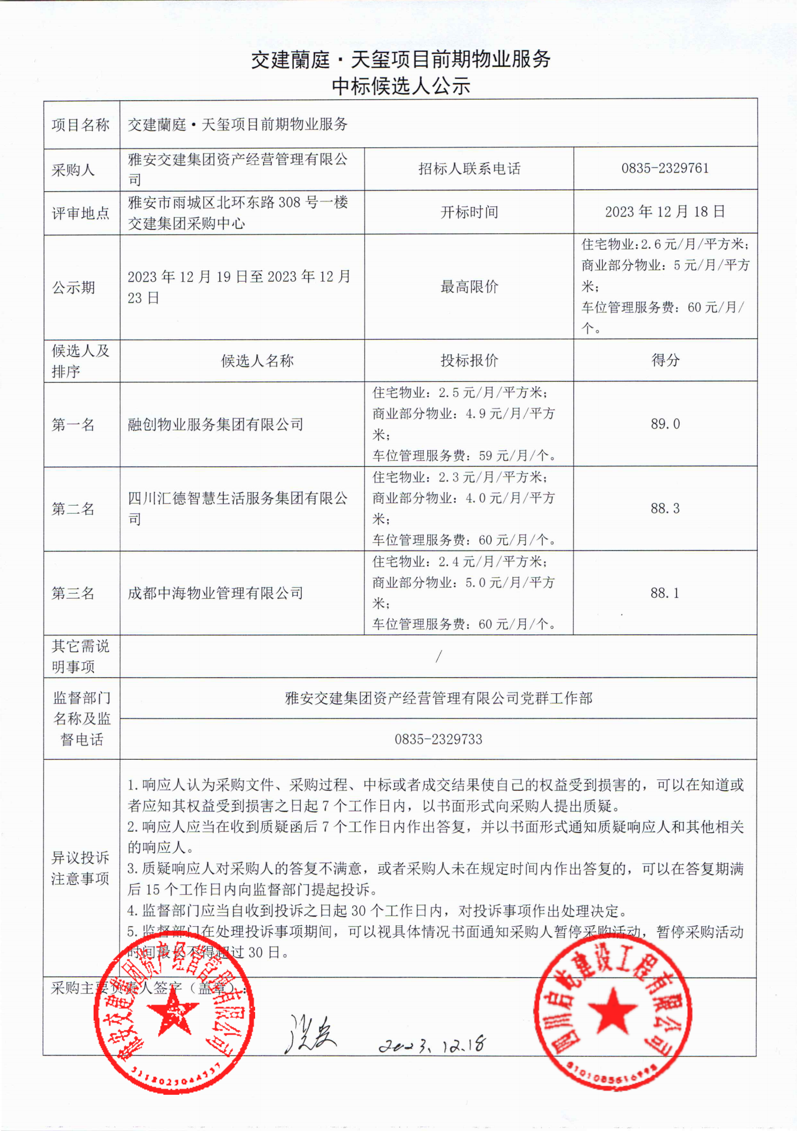 雅安交建集團資產(chǎn)經(jīng)營管理有限公司交建蘭庭·天璽項目前期物業(yè)服務(wù)中標(biāo)候選人公示