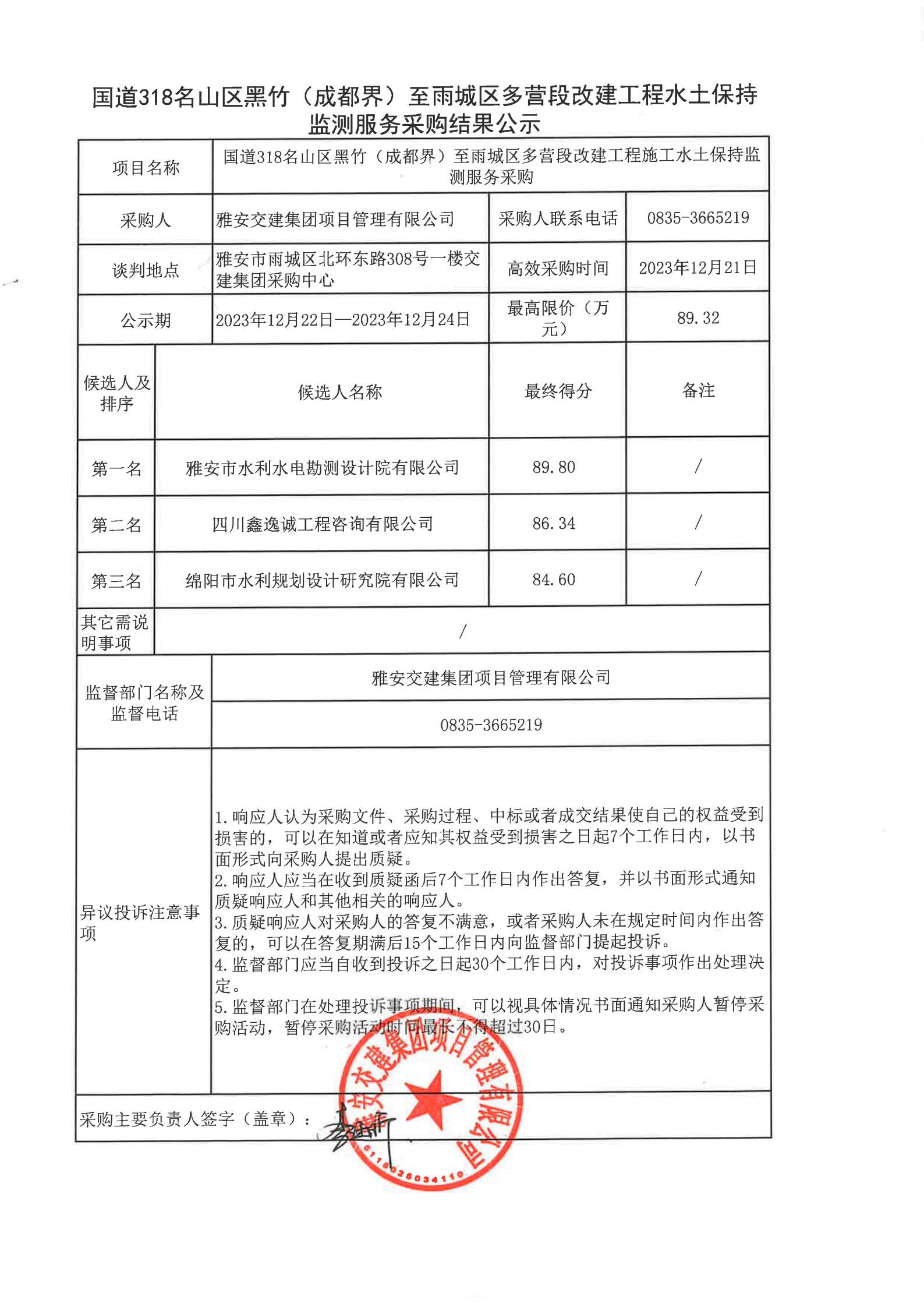雅安交建集團項目管理有限公司國道318名山區(qū)黑竹(成都界)至雨城區(qū)多營段改建工程水土保持監(jiān)測服務采購結果公示
