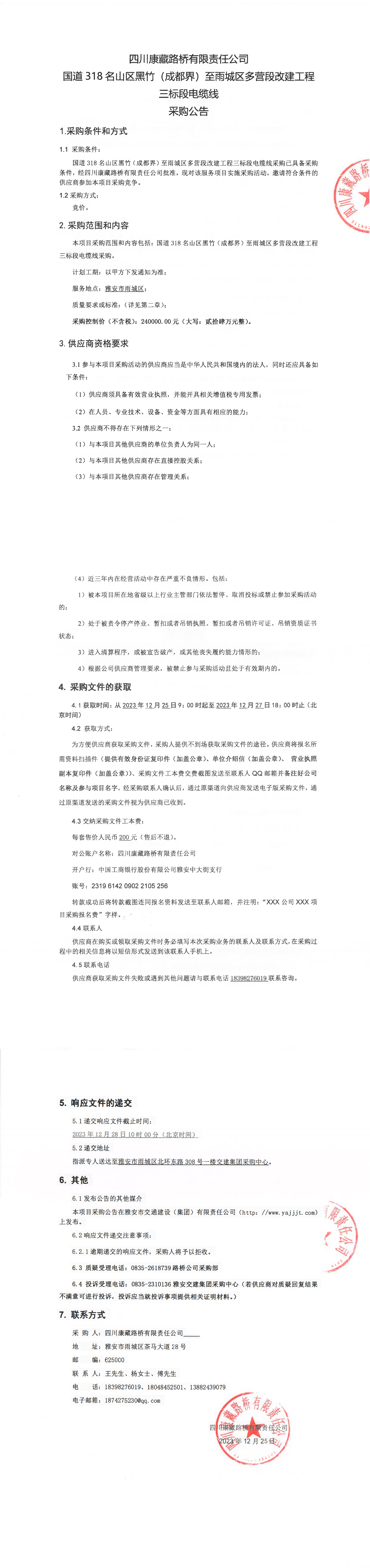 四川康藏路橋有限責(zé)任公司國(guó)道318名山區(qū)黑竹(成都界)至雨城區(qū)多營(yíng)段改建工程三標(biāo)段電纜線(xiàn)采購(gòu)公告