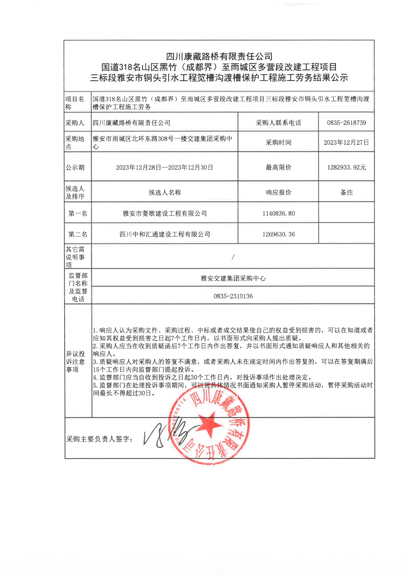 四川康藏路橋有限責(zé)任公司國道318名山區(qū)黑竹(成都界)至雨城區(qū)多營段改建工程項目三標(biāo)段雅安市銅頭引水工程筧槽溝渡槽保護(hù)工程施工勞務(wù)結(jié)果公示