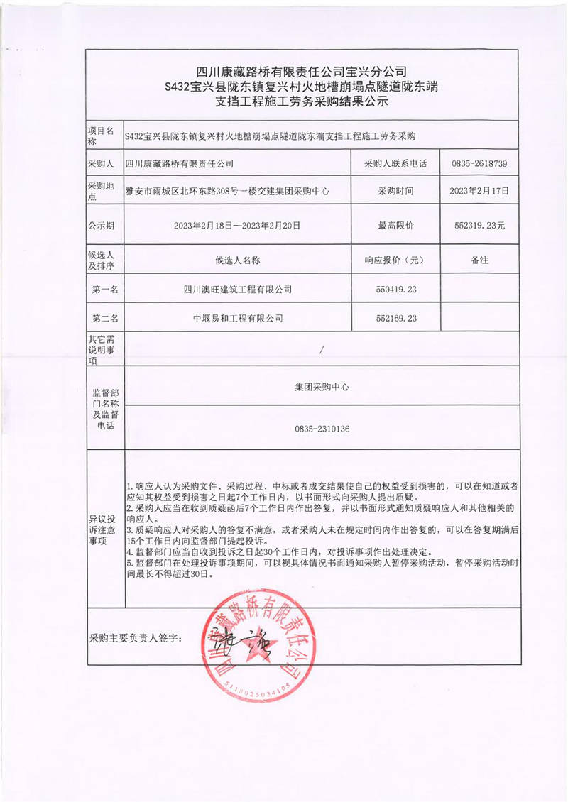 四川康藏路橋有限責(zé)任公司寶興分公司S432寶興縣隴東鎮(zhèn)復(fù)興村火地槽崩塌點(diǎn)隧道隴東端支擋工程勞務(wù)采購(gòu)結(jié)果公示