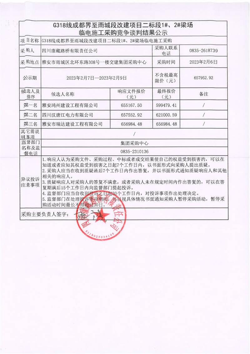 四川康藏路橋有限責(zé)任公司G318線成都界至雨城段改建項目二標段1#、2#梁場臨電施工采購競爭談判結(jié)果公示