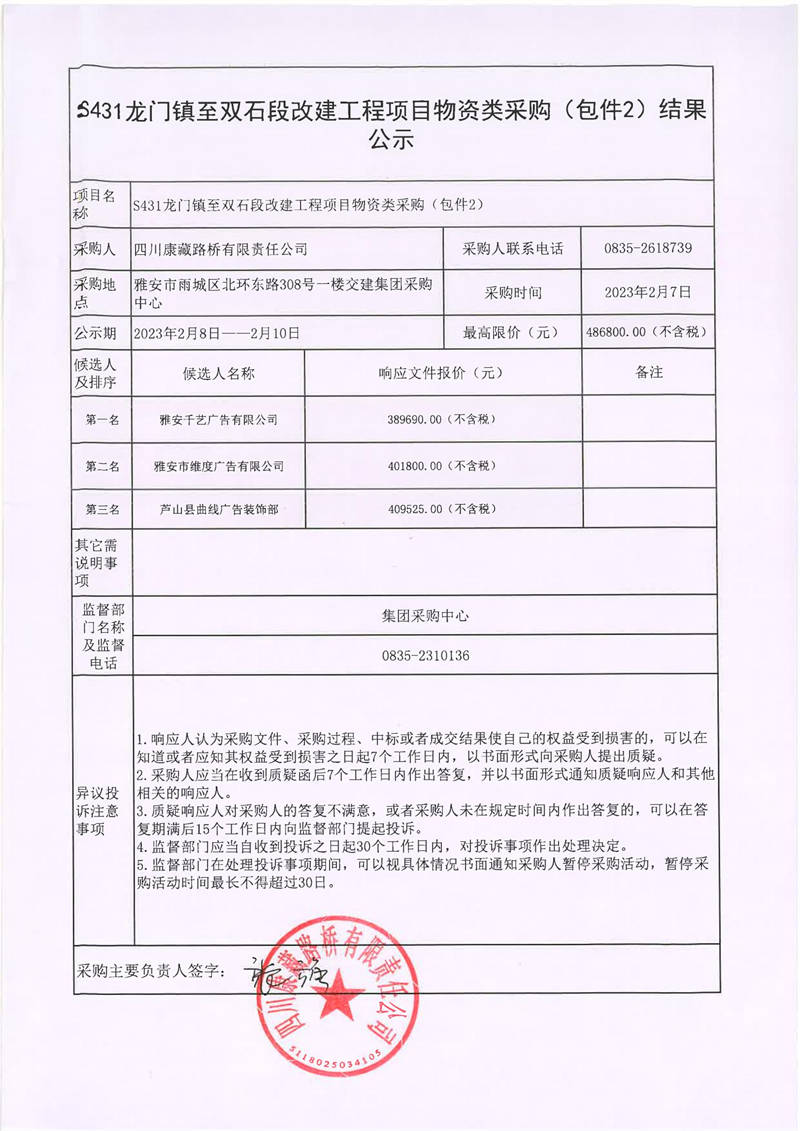 四川康藏路橋有限責(zé)任公司S431龍門鎮(zhèn)至雙石段改建工程項(xiàng)目物資類采購(包件1、包件2)結(jié)果公示
