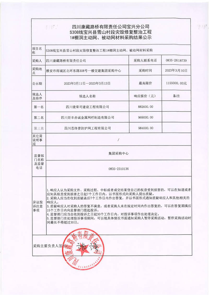 四川康藏路橋有限責任公司寶興分公司S308線寶興縣雪山村段災毀修復整治工程1#棚洞主動網、被動網材料采購結果公示