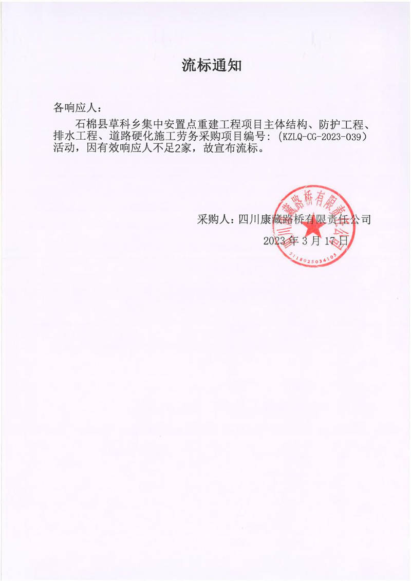 四川康藏路橋有限責(zé)任公司石棉草科鄉(xiāng)集中安置點重建工程項目主體結(jié)構(gòu)、防護(hù)工程、排水工程、道路硬化施工勞務(wù)采購流標(biāo)通知