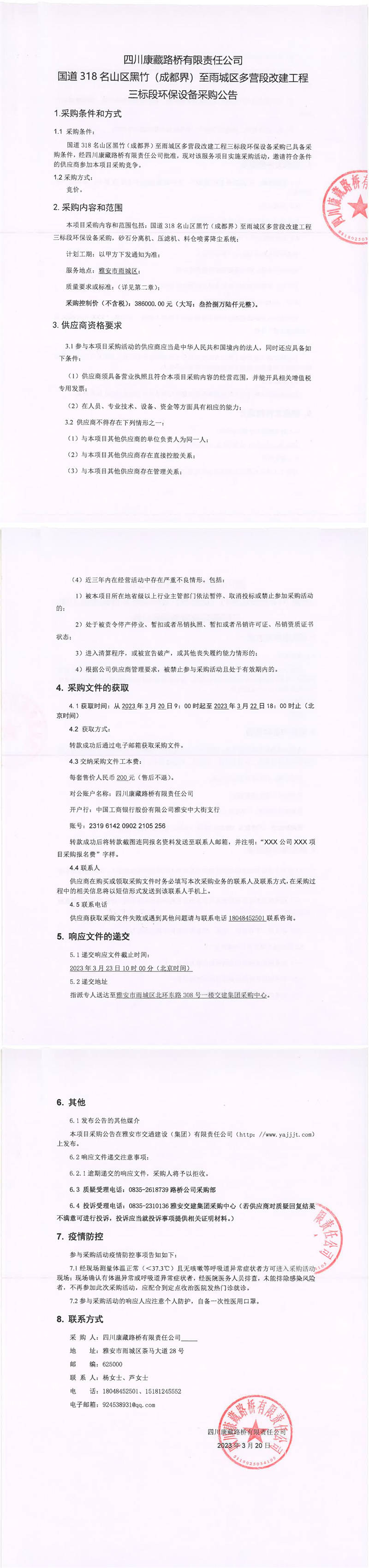 四川康藏路橋有限責(zé)任公司國道318名山區(qū)黑竹(成都界)至雨城區(qū)多營段改建工程三標(biāo)段環(huán)保設(shè)備采購公告