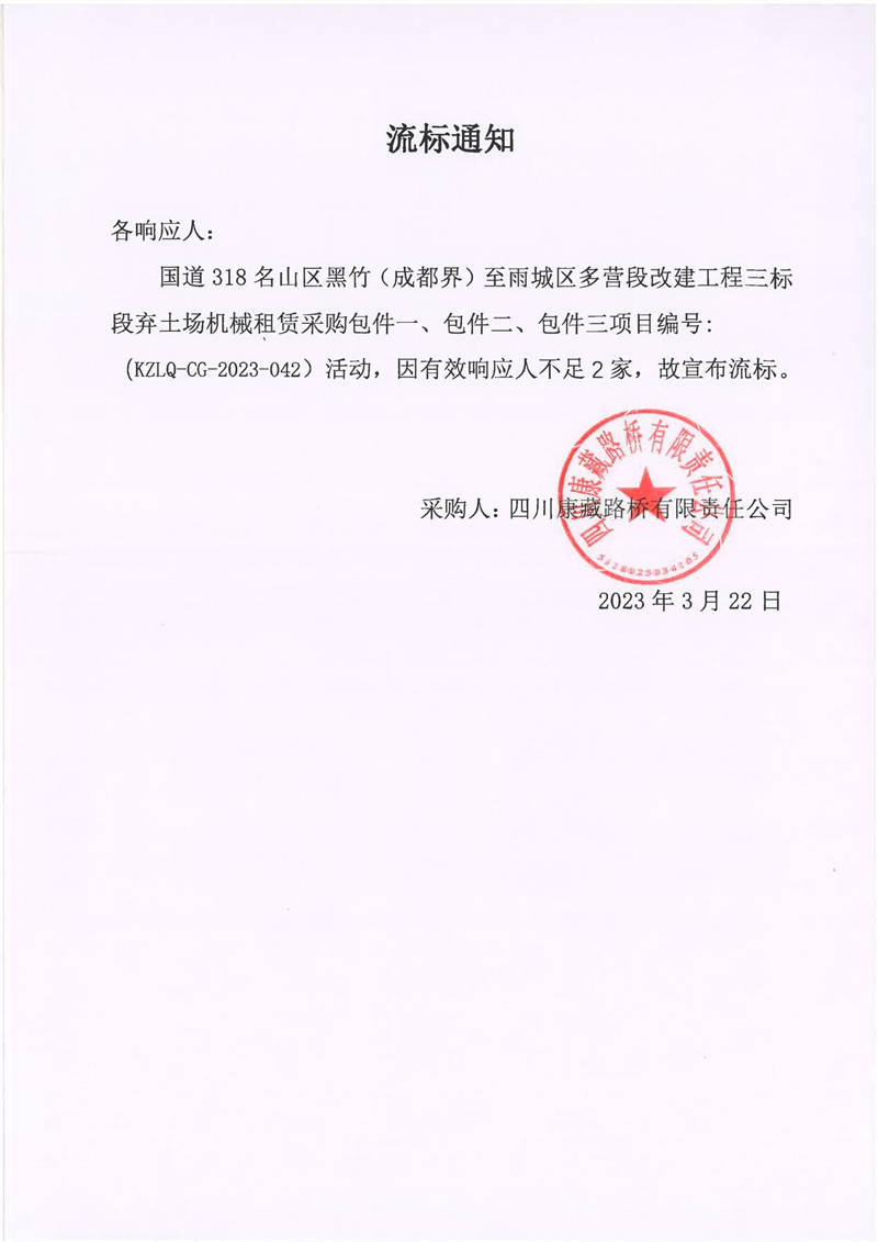 四川康藏路橋有限責任公司國道318名山區(qū)黑竹(成都界)至雨城區(qū)多營段改建工程三標段棄土場機械租賃采購流標通知