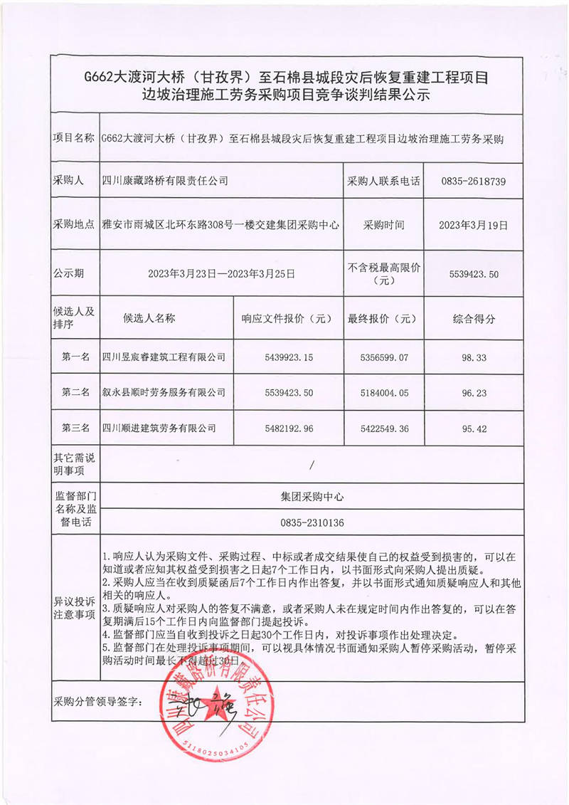 四川康藏路橋有限責(zé)任公司G662大渡河大橋(甘孜界)至石棉縣城段災(zāi)后恢復(fù)重建工程項(xiàng)目邊坡治理施工勞務(wù)采購項(xiàng)目競(jìng)爭(zhēng)談判結(jié)果公示