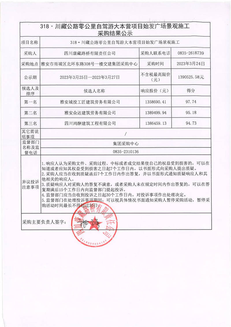 四川康藏路橋有限責(zé)任公司318·川藏公路零公里自駕游大本營項(xiàng)目始發(fā)廣場景觀施工采購結(jié)果公示