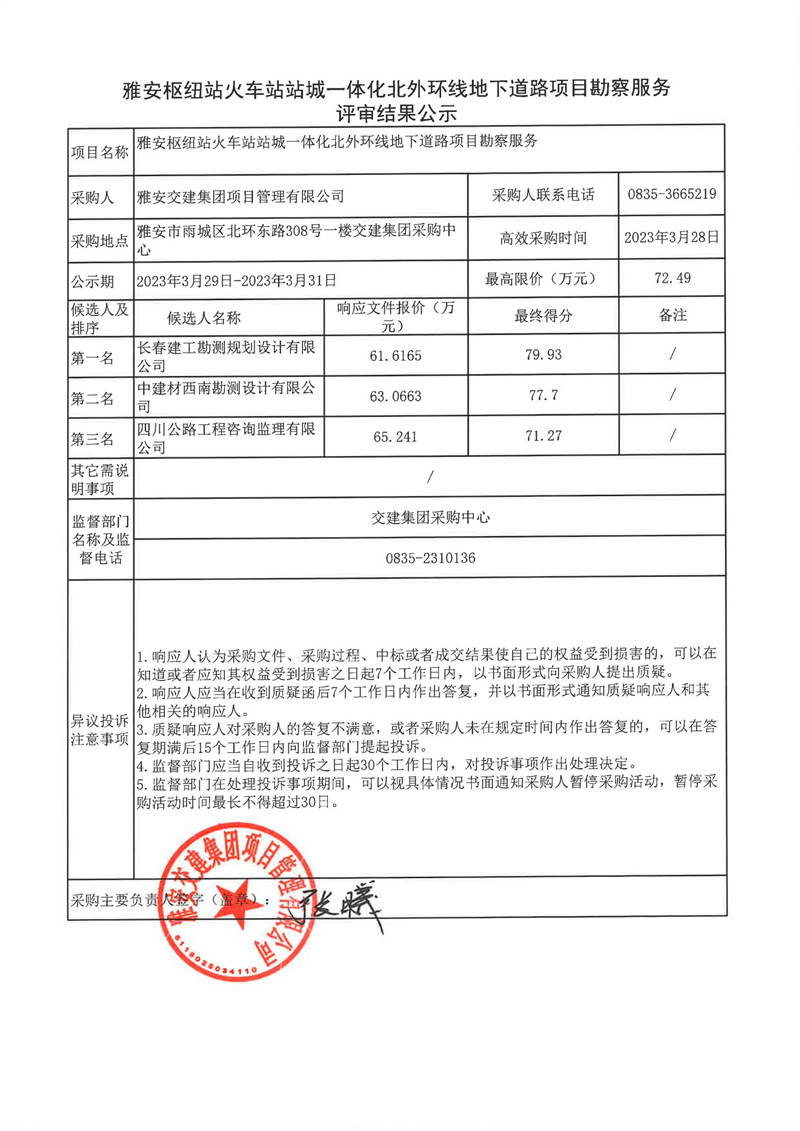 雅安交建集團(tuán)項(xiàng)目管理有限公司雅安樞紐站火車(chē)站站城一體化北外環(huán)線(xiàn)地下道路項(xiàng)目勘察服務(wù)評(píng)審結(jié)果公示